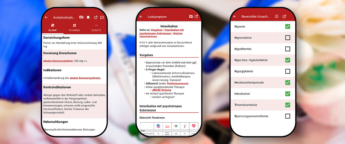 • Eine umfangreiche Bibliothek zum Nachschlagen von Krankheitsbildern und medizinischen Fachbegriffen (von A wie ARDS bis Z wie zerebrale Einklemmung)